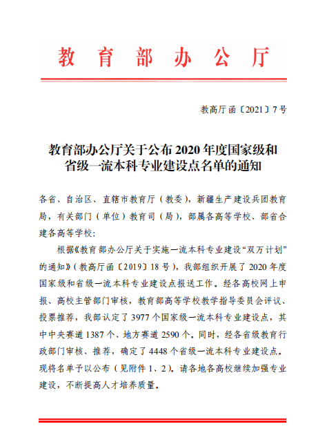 近日,教育部办公厅印发《关于公布2020年度国家级和省级一流本科专业建设点名单的通知》(教高厅函〔2021〕7号),南京农业大学mgm赌场