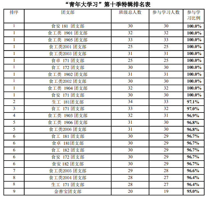 “青年大学习”第十季特辑各支部参与情况排名表
