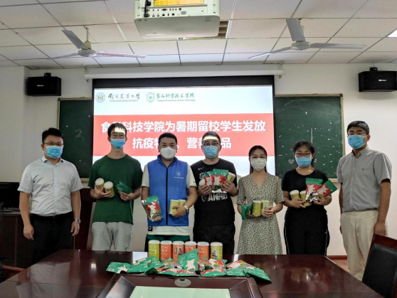 学院结合学生防疫抗疫、营养补充、夏季消暑等需求,联动南京拾分味道食品有限公司、江苏太古可口可乐饮料有限公司等食品企业,给在校62名本科生和272名研究生发放口罩等抗疫物资,并给每一位在校生发放猪蹄、可乐等营养、消暑食品,让同学们在疫情中感受学院的关怀和温暖。