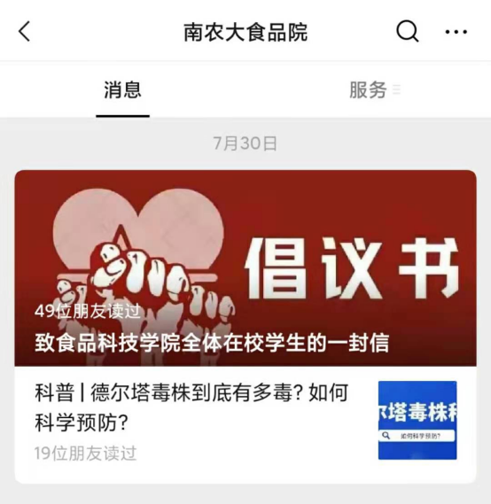 学院通过微信公众号及时发出倡议书,呼吁同学们积极配合防疫工作,并推出抗疫特刊为食品学子科普防疫指南,引导在校学生合理规划时间,及时调整学习、生活计划。