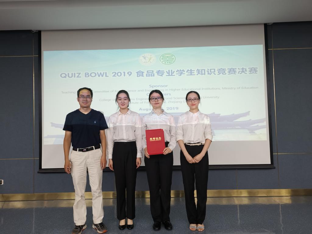 2019年8月28日,由教育部高等学校食品科学与工程专业教学指导委员会主办的QUIZ BOWL 2019食品专业学生全英文知识竞赛决赛在杭州浙江大学举行。由我院潘磊庆教授指导,秦岳、阮圣玥、彭璐等三名本科生组建的“Popcorn”战队经过层层选拔,在本次比赛中斩获三等奖。