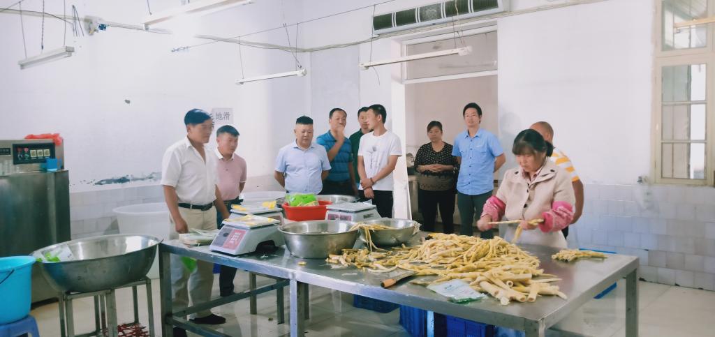 韩永斌教授,吴涛老师,麻江县扶贫办副主任、兰山村第一书记、公共管理学院团委书记汪浩,麻江县河山村第一书记、学生工作部(处)民族学生事务管理办公室主任裴海岩的陪同下,麻江县人大常委会副主任王芝莲一行赶赴安徽省旌德县朝辉绿色食品有限公司考察学习蕨菜、竹笋等深加工产业。韩永斌教授就兰山村特有资源蕨菜、竹笋的深加工技术流程作了详细的介绍,并为兰山村度身定制了相关加工技术规程,为兰山村的第一个特色加工产业发展奠定了良好的基础。