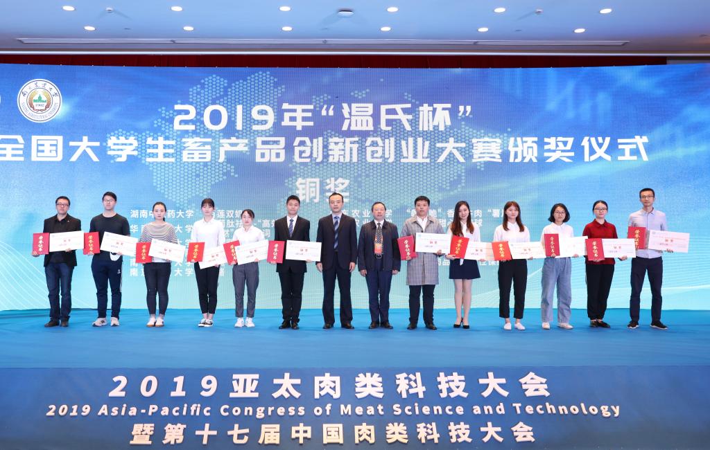 10月12日上午,“温氏杯”全国大学生畜产品创新创业大赛决赛颁奖典礼在南京国际会议中心举办的亚太肉类科技大会上举行。农业农村部畜牧兽医局副局长王俊勋、中国畜产品加工研究会会长周光宏教授、温氏股份养禽事业部副总裁秦开田、荷兰马斯特里赫特大学教授Mark Post、中国畜产品加工研究会名誉副会长李洪军教授、农业农村部屠宰技术中心副处长高胜普、中国畜产品加工研究会副会长、杭州艾博科技工程有限公司董事长韩青荣和平遥牛肉集团董事长雷秉义等人应邀出席本次颁奖典礼并为获奖者颁奖。颁奖典礼由南京农业大学mgm赌场