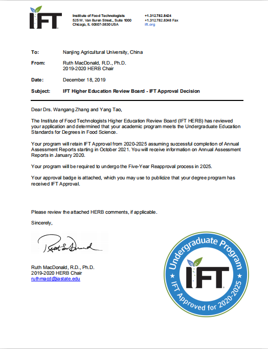 食品科学与工程专业也成为2018新版IFT认证标准执行后,国内首个通过IFT国际认证的专业。