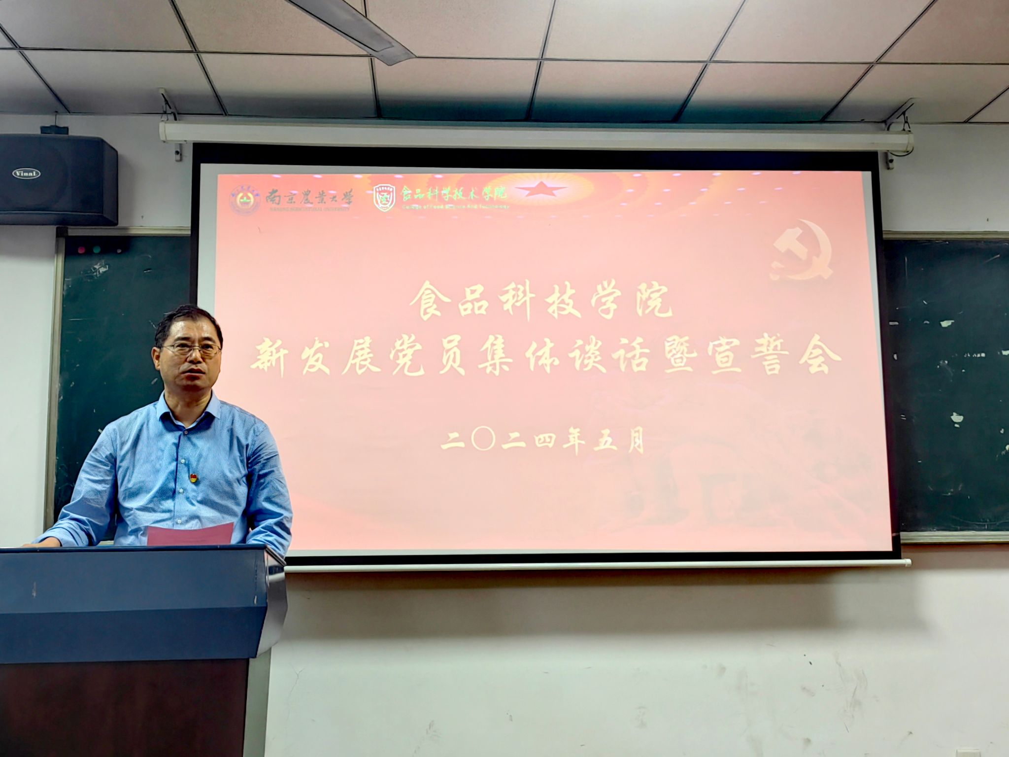 孙健代表学院党委对新发展党员表示热烈祝贺,并对新发展党员提出四点希望:一是强化政治理论学习,坚定政治立场。要把理论学习作为终身课题,不断提升自身理论修养,关注国家和时代发展形势,了解新中国发展取得的各项成绩来之不易。增强“四个意识”、坚定“四个自信”、做到“两个维护”;二是对党绝对忠诚,牢记责任使命。要明确党员的初心使命,深入开展党纪学习教育,严守党的政治纪律和政治规矩。三是发挥党员的先锋模范作用,做好表率。时刻严格要求、鞭策、激励自己,做好表率、亮出旗帜,传承党的光荣传统和优良作风;四是立大志、明大德、成大才、担大任。坚持为国奉献、为民服务。 坚持为公不为私,为助推食品产业高质量发展贡献青春力量。