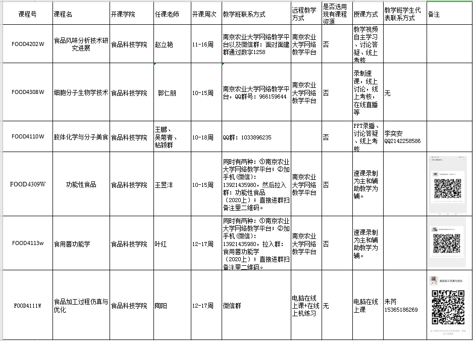 2019-2020第二学期食品院教授开放课程在线教学联系方式