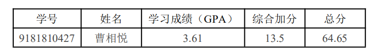 经学校研究,现为食品科技学院增加推荐免试研究生名额1个,根据《mgm赌场 关于推荐免试研究生(含“直博生”)推荐工作的补充规定(试行)》第十条规定,增补人员根据替补学生加权总分从高到低排序确定,现予以公示。