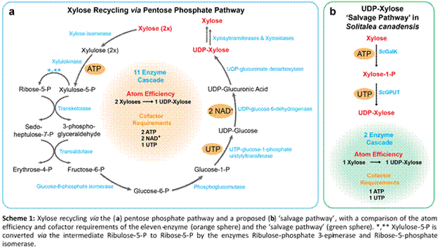 此外,同样来自Solitalea canadensis的葡萄糖-1-磷酸尿苷转移酶(ScGPUT) 能够在三磷酸尿苷(UTP)存在的情况下进一步将上述合成的木糖-1-磷酸(Xylose-1-P)转化为尿苷二磷酸木糖 (UDP -木糖),从而可以作为木糖的活化糖基供体合成含有木糖的终末产物,实现木糖的循环再生利用。 这种双酶“木糖再生补救途径”(图1b)是自17 年前在细菌中发现“岩藻糖再生补救途径”(Science, 2005, 307 (5716):1778-81) 后发现的另一种细菌中存在的新的“单糖再生补救途径”,与已知的磷酸戊糖的木糖再生途径(图1a)相比,这种新型“木糖再生补救途径”显著降低了对辅助因子的需求,同时极大提高了原子经济性(Atom economy)和碳效率(Carbon efficiency)。