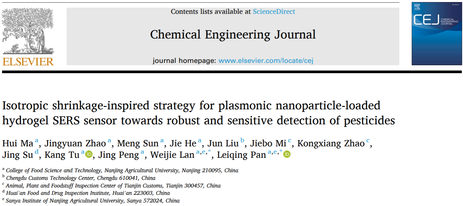 屠康教授和潘磊庆教授团队,利用水凝胶体系中“乙醇-水”快速置换促使柔性表面增强拉曼光谱(SERS)基底“热点”致密化,实现了快速、灵敏、多场景的农药残留分析。相关研究成果以“Isotropic shrinkage-inspired strategy for plasmonic nanoparticle-loaded hydrogel SERS sensor towards robust and sensitive detection of pesticides”为题,在国际著名期刊《Chemical Engineering Journal》在线发表。