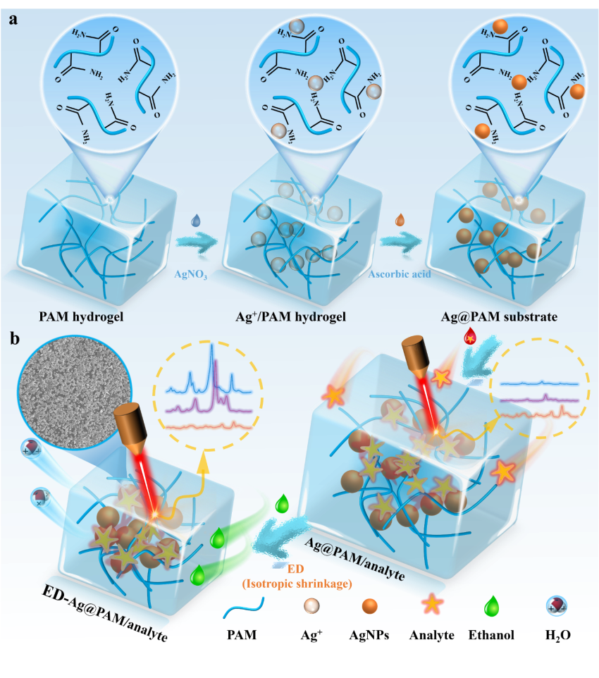 潘磊庆教授团队创新性地利用聚丙烯酰胺(PAM)水凝胶作为SERS基底框架,通过“乙醇-水”快速置换方法,实现了水凝胶的“各向同性”收缩。这种收缩方式使得水凝胶中的银纳米粒子(AgNPs)紧密聚集,形成了均匀且密集的“热点”分布,显著增强了拉曼信号的强度和稳定性。实验表明,与传统风干(AD)方法相比,乙醇脱水(ED)处理的Ag@PAM水凝胶在12分钟内即可实现快速SERS增强,且信号均匀性显著提高(RSD < 10%),对4-硝基苯硫醇(4-NBT)的检测信号提升了17倍,检出限(LOD)低至2.21×10−12 M (~3.43 × 10–13 g⋅mL−1)。